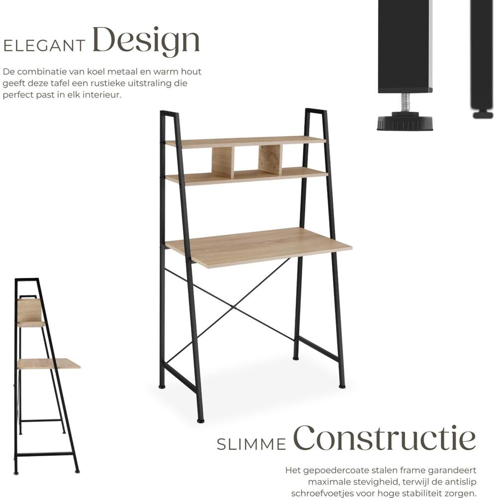 Daarnaast heeft de plank boven het tafelblad zijn eigen charme; perfect om een monitor op te plaatsen of om je favoriete boeken binnen handbereik te houden.